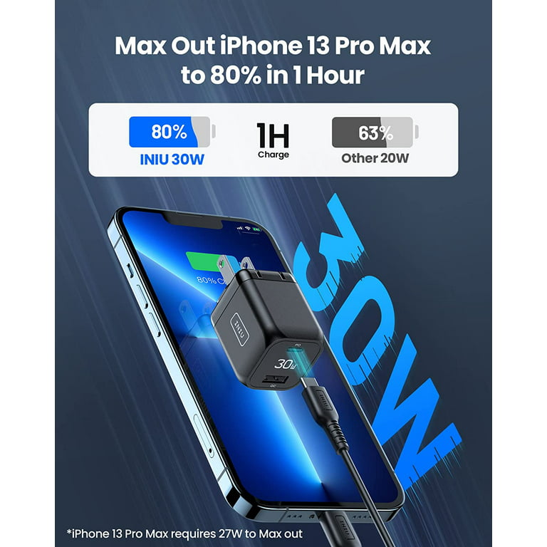 - ✅【Max out iPhone 13 Pro Max up to 80% in 1 hour】Superior to the old-fashioned 20W, INIU usbc charger iphone gives a 27W-peak-speed charge to your iPhone 13 Pro Max, saving you 30 mins. Wake up and find a dead phone in the morning? Let the INIU phone charger bring it back to life while you take a shower.